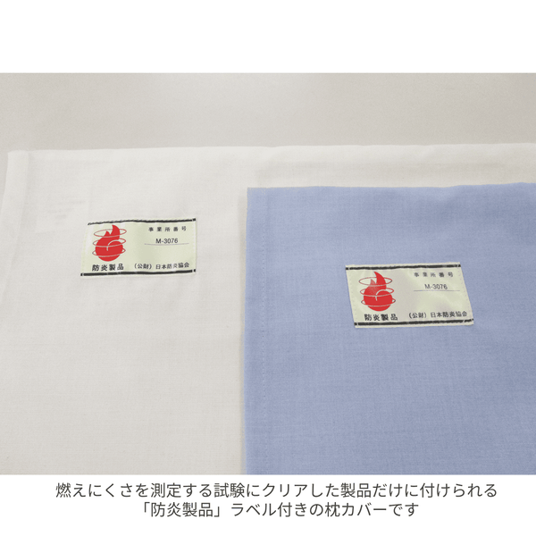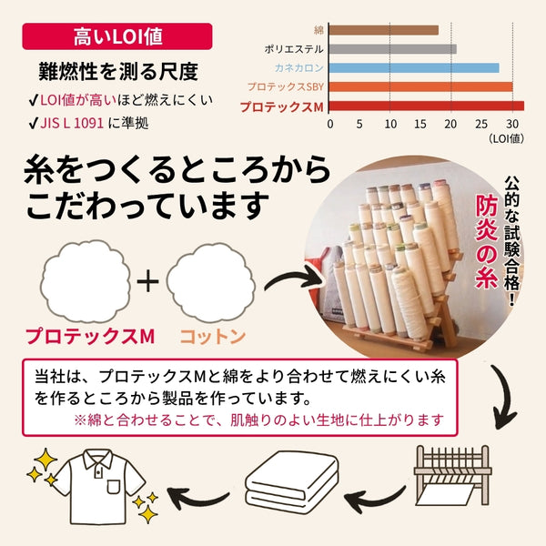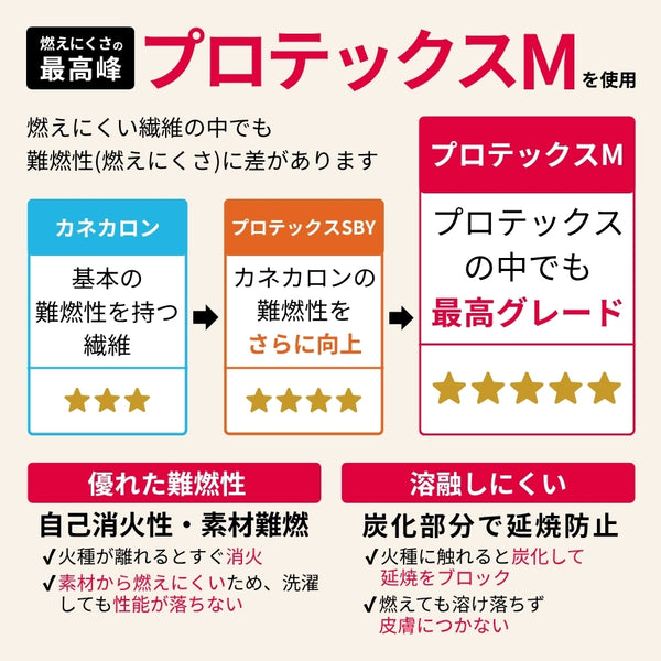 日本防炎協会認定の防炎製品マーク付き。難燃繊維「プロテックスM」を使用し、万が一の火災時にも燃え広がりを抑える安心設計です。